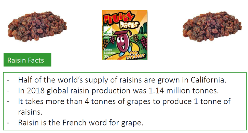 Raisins are nutritious as part of a healthy diet but as dried fruit can stick to teeth and can cause tooth decay it is better to consume dried fruit as part of a meal and not as a between meal snack. Further key advice on keeping teeth healthy can be found at the following NHS websites:
